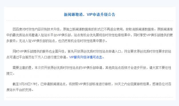 3月20日,百度發(fā)布公告稱將取消新聞源,將實現(xiàn)時效性內(nèi)容識別技術(shù)的升級,將原新聞源數(shù)據(jù)庫中的優(yōu)質(zhì)站點邀請至VIP俱樂部。